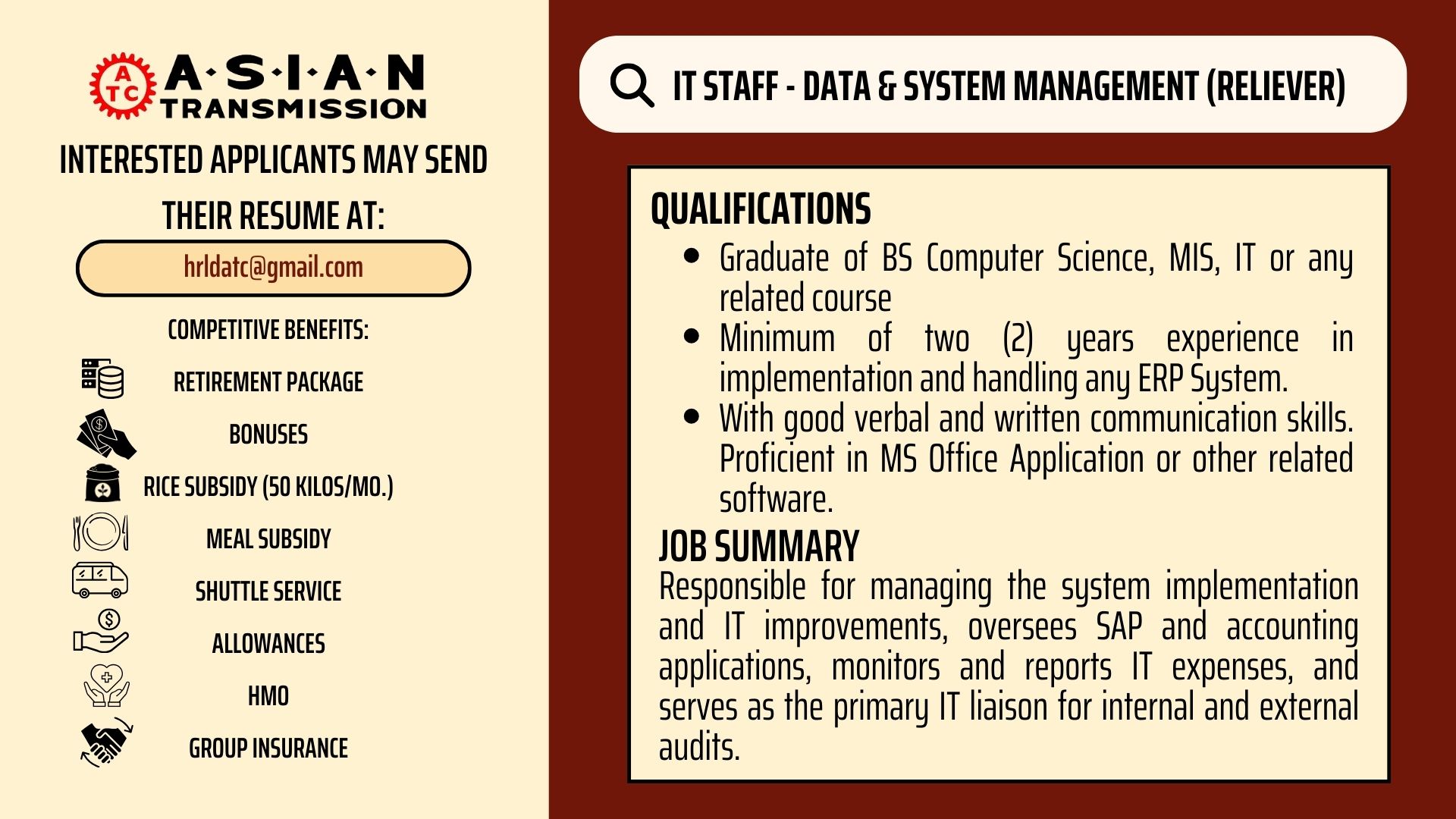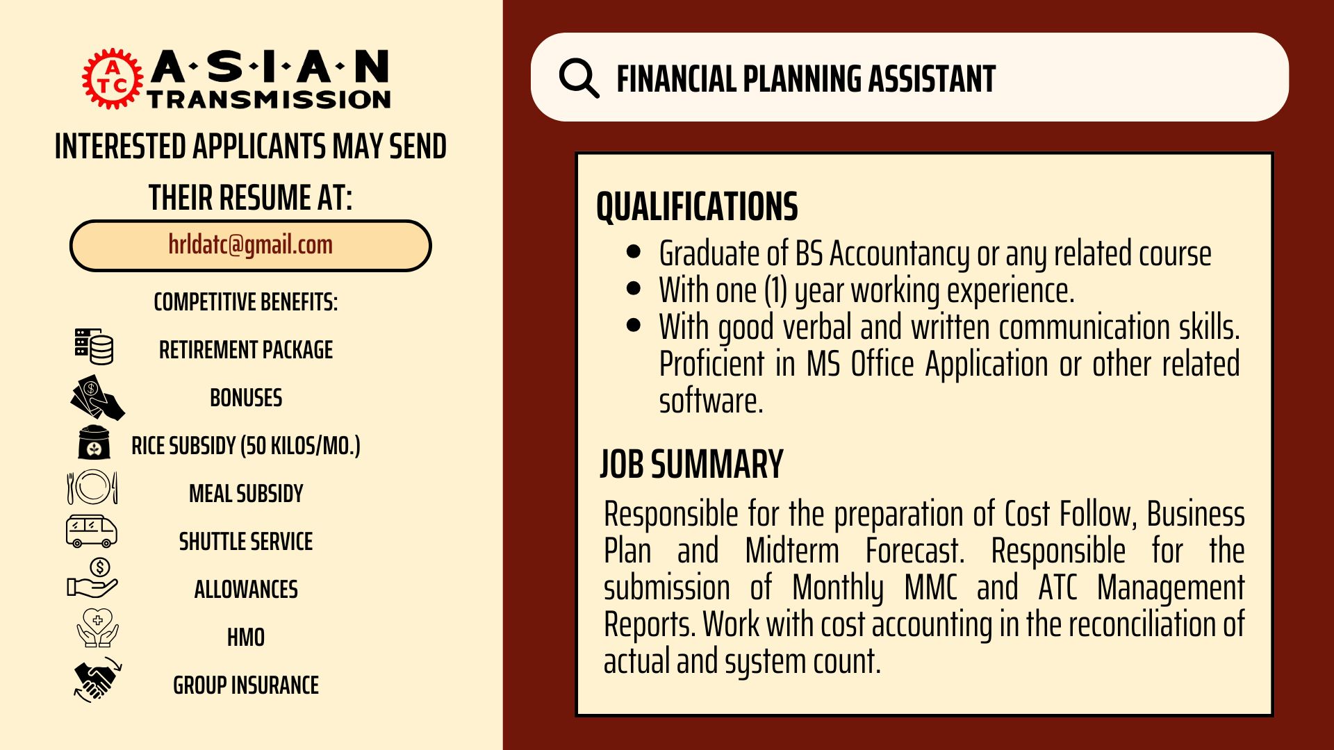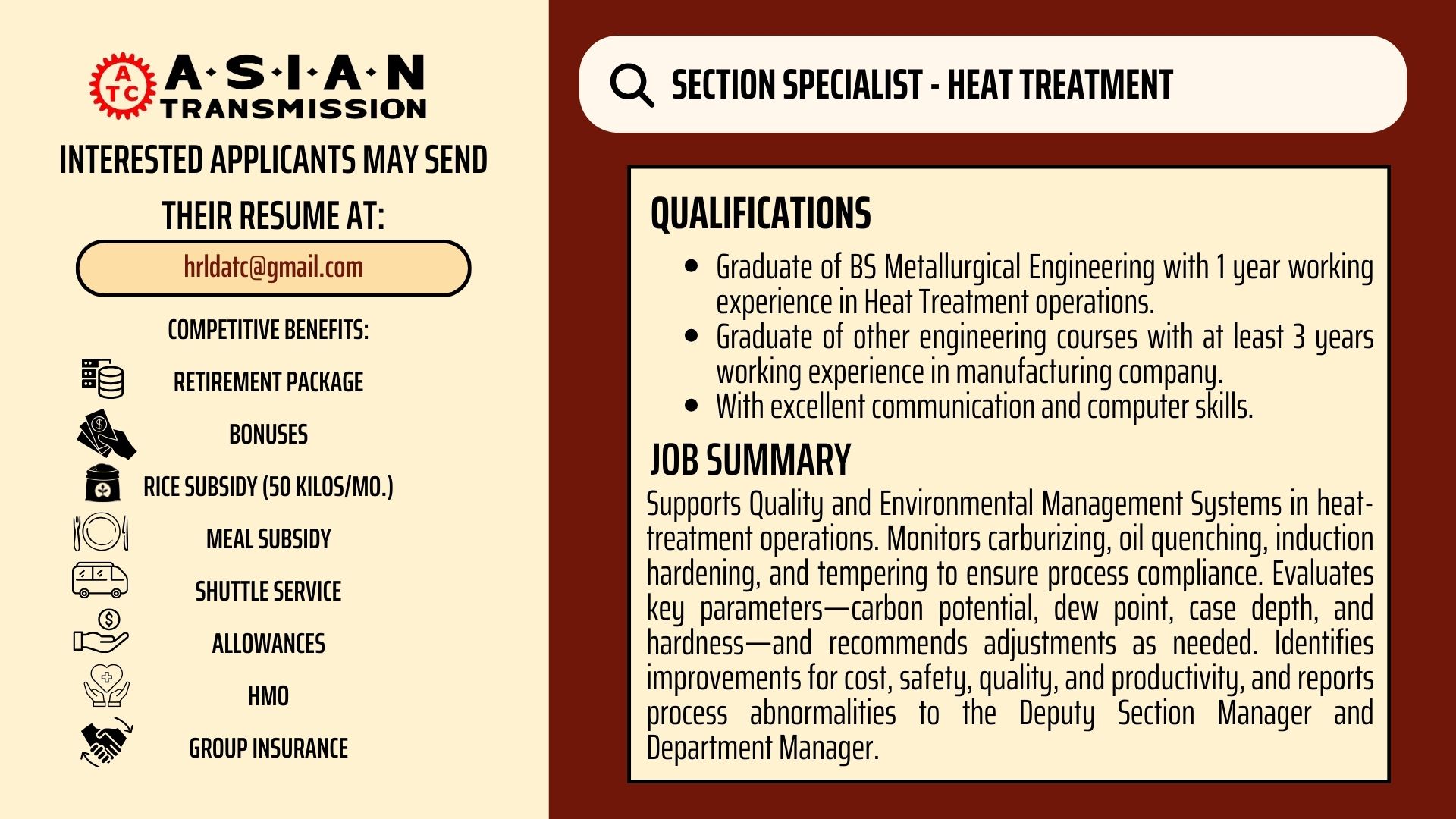 Interested applicants may send their resume with the subject APPLICANT_SURNAME_(desired position)to recruitment@asian-transmission.com.ph.